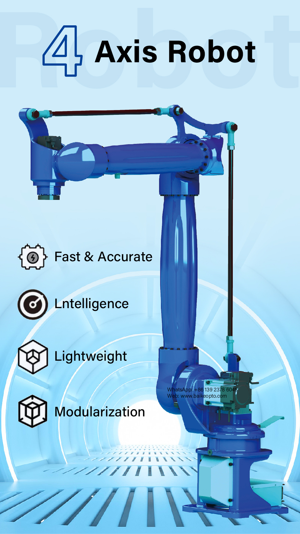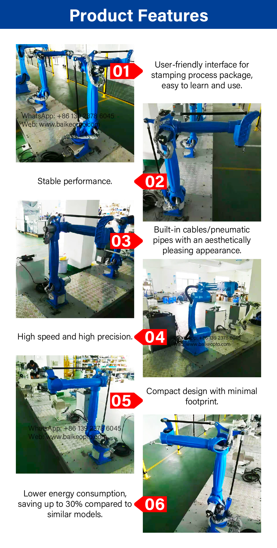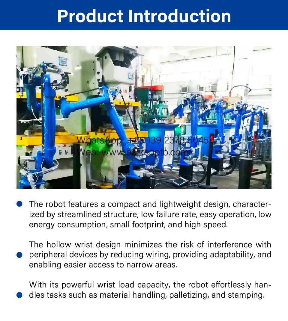 Palletizing robot, stamping robot, handling robot, four-axis handling robot.The robot features a compact and lightweight design, characterized by streamlined structure, low failure rate, easy operation, low energy consumption, small footprint, and high speed.The hollow wrist design minimizes the risk of interference with peripheral devices by reducing wiring, providing adaptability, and enabling easier access to narrow areas.With its powerful wrist load capacity, the robot effortlessly handles tasks such as material handling, palletizing, Loading and unloading,stamping.Product features: