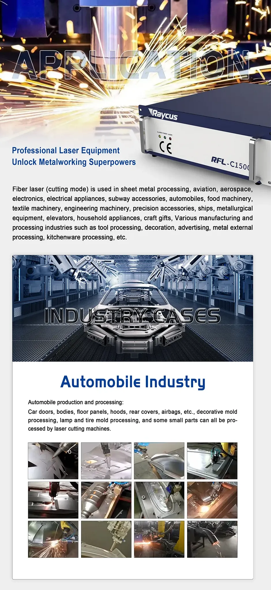 | Raycus Laser sources are widely used in multiple industries. such as maunfacturing industry, Automative industry , Aerospace, Petrochemical Industry, Rail Traffic, 3C Electrinic , Sheet metal working , Advertising Sign, Kitchen industry, Househeld appliance, fitness equipment, precision Machinery,etc. |