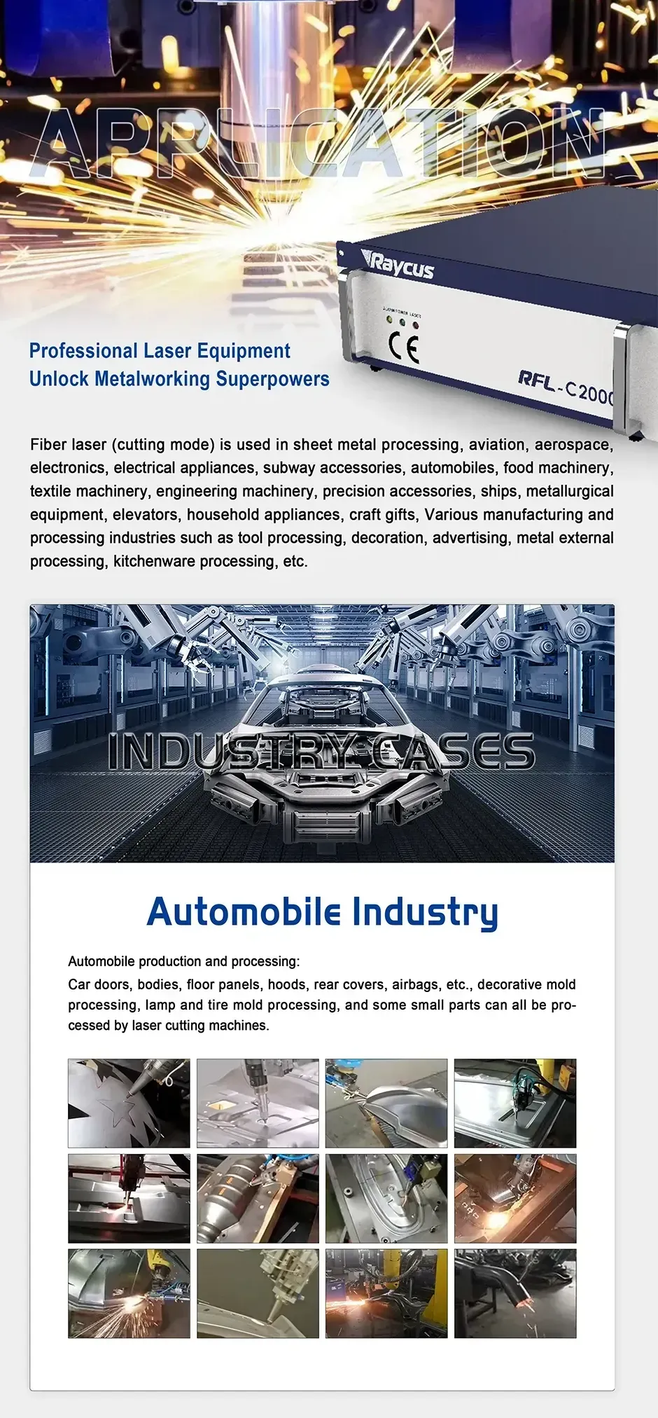 | Raycus Laser sources are widely used in multiple industries. such as maunfacturing industry, Automative industry , Aerospace, Petrochemical Industry, Rail Traffic, 3C Electrinic , Sheet metal working , Advertising Sign, Kitchen industry, Househeld appliance, fitness equipment, precision Machinery,etc. |
